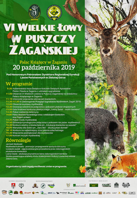 Nächste Große Jagt steht uns bevor. Am 20. Oktober laden wir zum Schlosspark und dem Herzoglichen Schloss in Żagań ein. Auf dem Programm stehen u.a. Shows, Workshops, Wettbewerbe und Konzerte. Viele weitere Attraktionen, wie Jahrmarkt mit kulinarischen Leckereien, Honigen und Likören, warten auch auf die Besucher.
